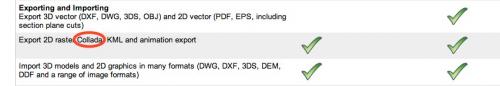 The next step would be to export as Collada. Since it was listed as a 2D export format, I looked for it in the 2D export menu, but JPG, PNG and TIFF were the only options. So I checked the 3D export menu, which only listed KML and a tempting link to upgrade to Pro. The help menu didn’t seem to mention Collada export either. Initially, I put this down to an error by Google, and that this was indeed a Pro feature that had slipped into the free version’s feature list.