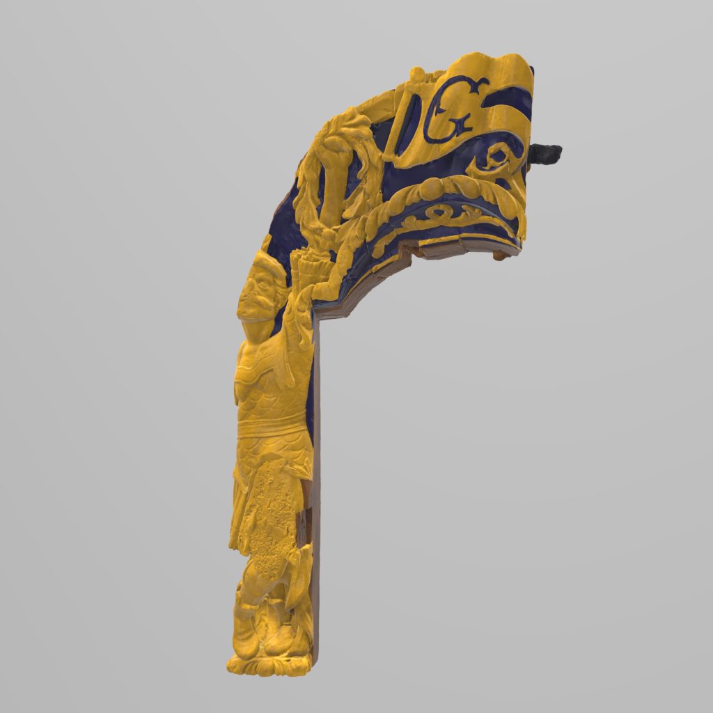 After its discovery, the stern carving was transported to the Mary Rose Trust in Portsmouth for conservation. During its stay, the carving was 3D laser scanned by reality capture pioneers Archaeoptics Ltd in 2006. Their scan, accurate to less than a millimetre was exceptional. However, due to the limitations of the technology at the time, and the amount of reflective water in and around the tank, some parts physically couldn’t be scanned, including one side (which was simply plain unadorned wood) as they were simply too heavy to move and turn over.