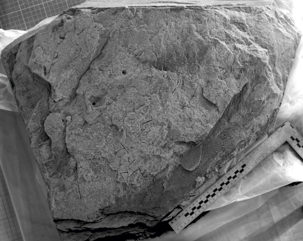 The inscription is difficult because the marks are light, uneven and easily confused with the natural texture of the slate. Some surface features can look like letters until they are tested carefully. This was not simply a matter of taking a better photograph. The real problem was how to separate deliberate incisions from geological lines, pockmarks and other irregularities on a rough stone surface.