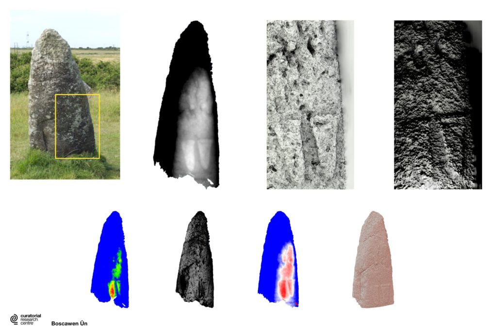 As part of my technique development I investigated prehistoric carvings at a local stone circle close to Penzance, Cornwall. First noticed in 1986 and interpreted as a pair of axes, I recorded them using SfM photogrammetry. I filtered the 3D surface data using a number of different approaches (including grayscale and colour depth shading, ambient occlusion, Cook-Torrance shading) to produce the clearest possible images of the carvings.