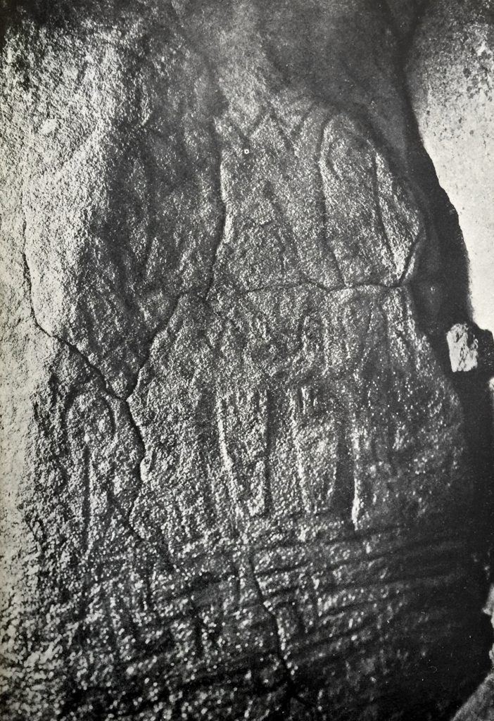 My interpretation suggests that they represent a pair of feet, sole outwards. My subsequent research in the library of the Society of Antiquaries revealed a similar carving (destroyed in the 1940s) at Dolmen du Petit-Mont at Arzon in Brittany.
